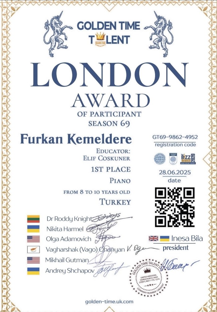 4. sınıf öğrencilerimizden Furkan Kemeldere, Londra’da tüm ülkelerin katıldığı online piyano yarışmasında 1. olarak bizlere büyük bir gurur yaşattı! 🏆🌍👏