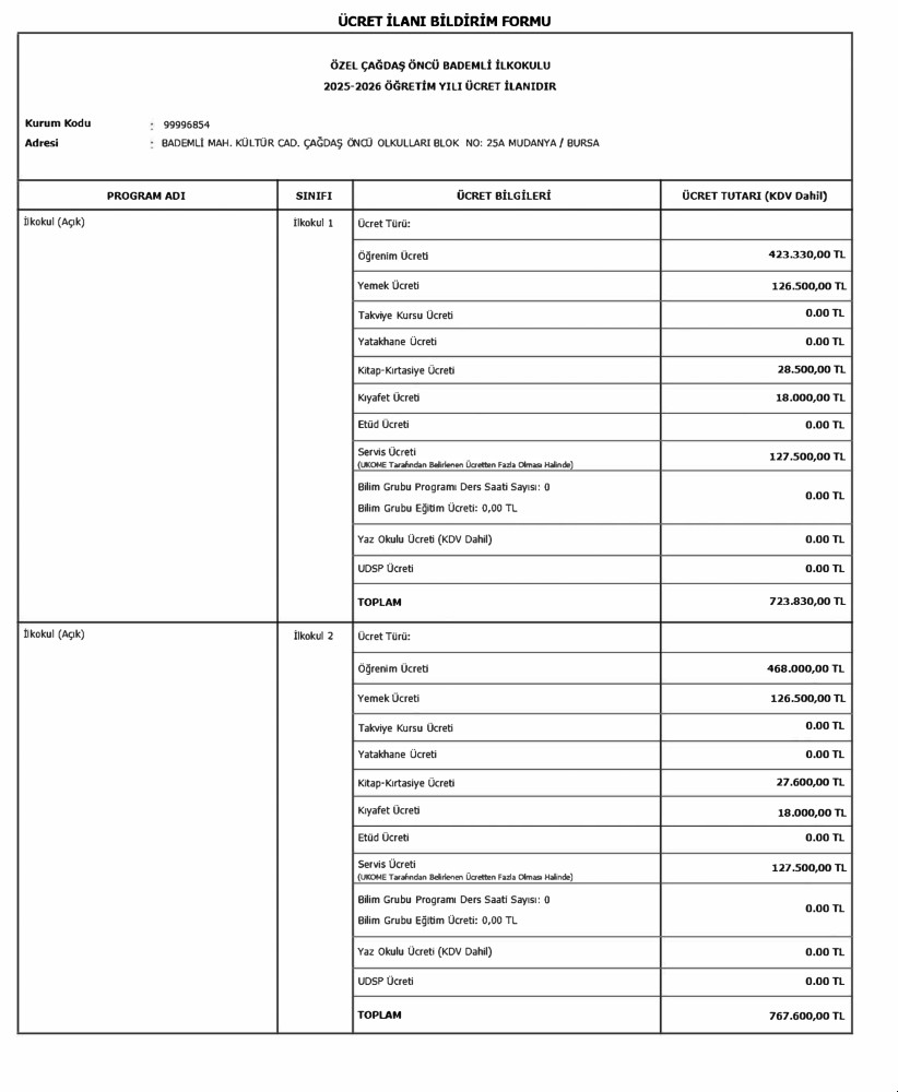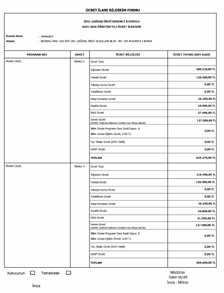 2025-2026 EĞİTİM ÖĞRETİM YILI BADEMLİ KAMPÜSÜ ÜCRET DUYURUSU