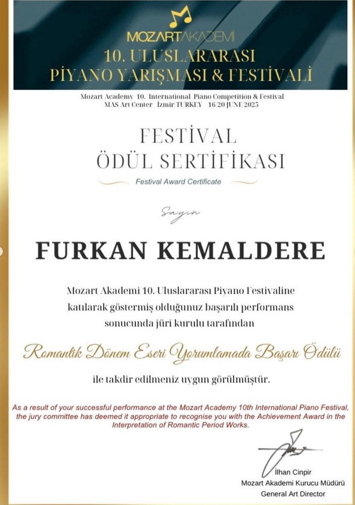 Ayrıca 10. Uluslararası Mozart Akademi Piyano Festivali’nde Romantik Dönem Eser Yorumlama dalında başarı ödülüne layık görüldü! 🎶🎖️