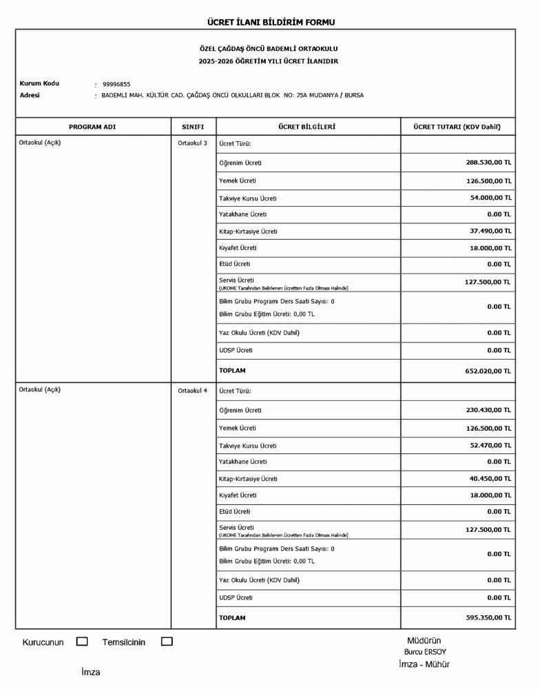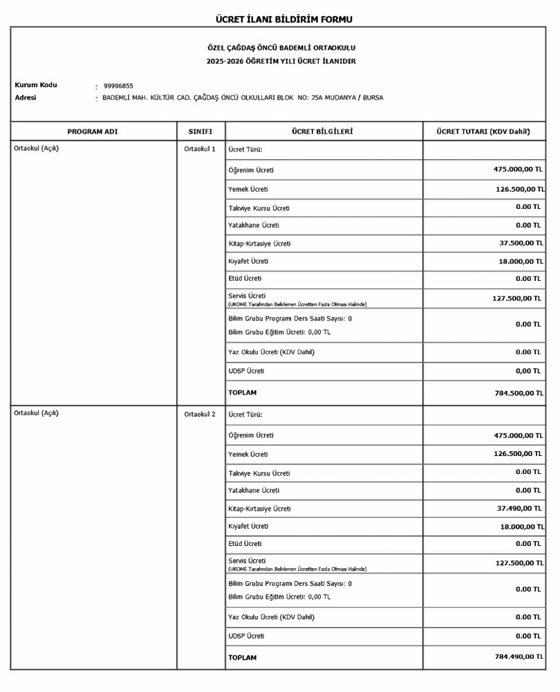 2025-2026 EĞİTİM ÖĞRETİM YILI BADEMLİ KAMPÜSÜ ÜCRET DUYURUSU
